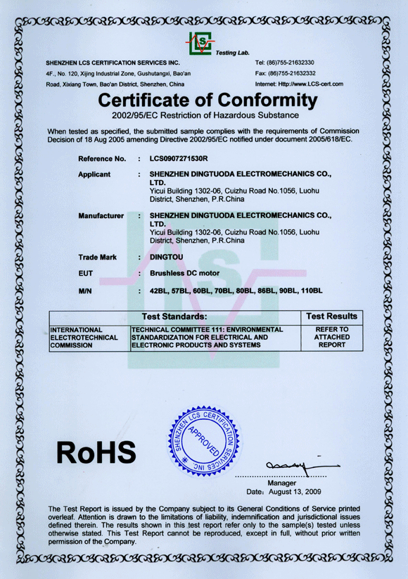 首頁->產(chǎn)品認(rèn)證->無刷電機(jī)RoHS認(rèn)證證書